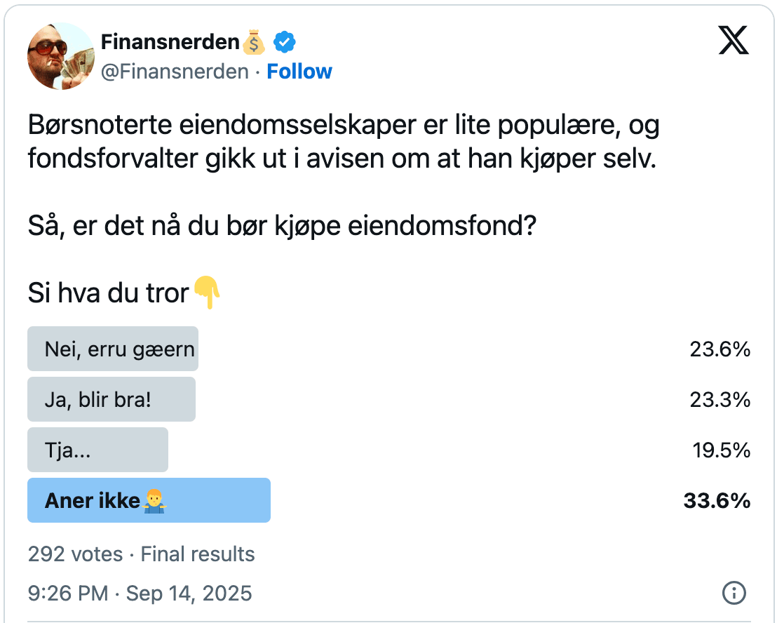 Investorer flest har ikke trua: Følgerne mine på Twitter derimot har ikke trua på nordiske eiendomsfond.