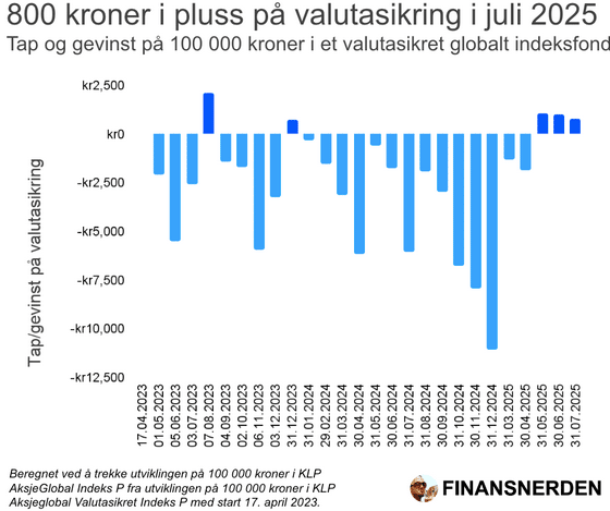 Sammenlignet med å investere i tilsvarende fond uten valutasikring, var jeg stort sett i minus. Jeg ga opp veddemålet med 800 kroner i gevinst i juli i fjor👇
