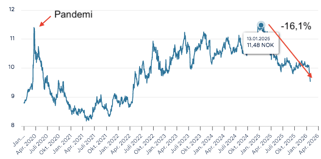 Hva har skjedd? En dollar har gått fra å koste 11,48 kroner til 9,63 kroner siden 13. januar 2025, en endring på cirka 16,1%.