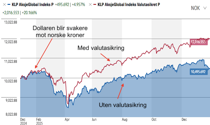 Valutasikring er aldri perfekt og koster ekstra. Men forskjellen mellom globale indeksfond med og uten valutasikring er markant siden 31.desember 2024.