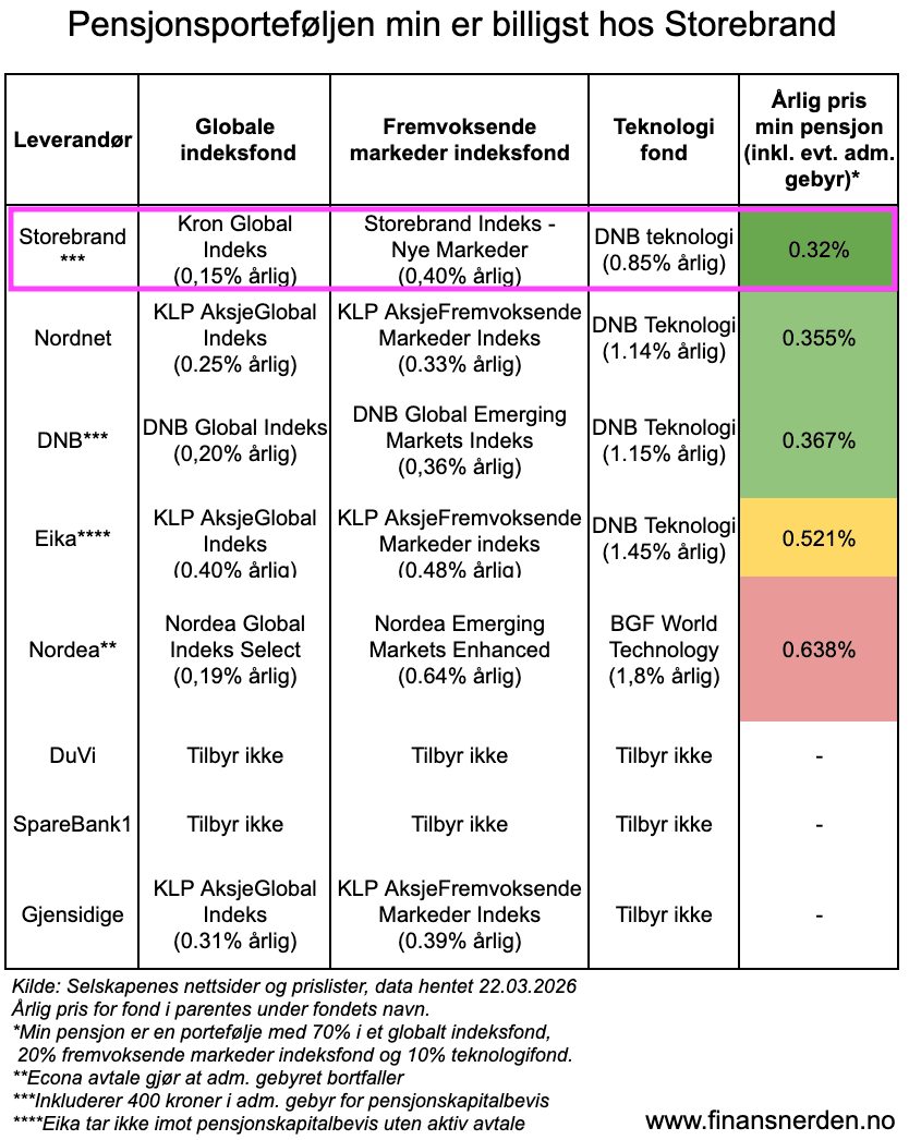 1. Fortsatt greie priser: Pensjonsporteføljen min og priser hos Storebrand Livsforsikring, da jeg sjekket om jeg burde flytte pensjonskontoen:
