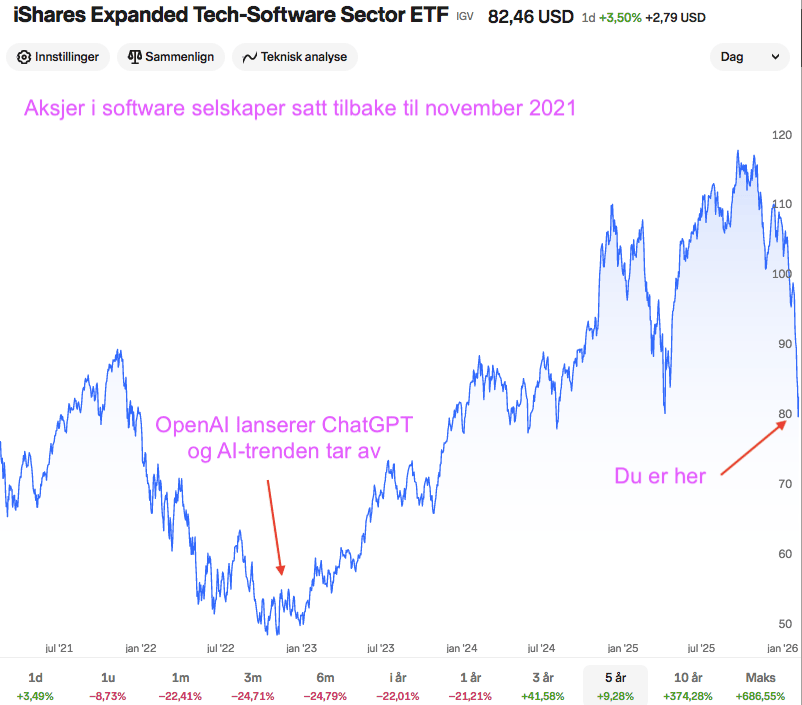 Et forsøk på å forklare: Investorene vurderer nå software selskapene etter om de vil bli skrudd eller ikke skrudd av AI. Det hjelper lite om inntjeningen i dag er god for disse vekstselskapene om ikke investorene tror de vil tjene mye mer i fremtiden.