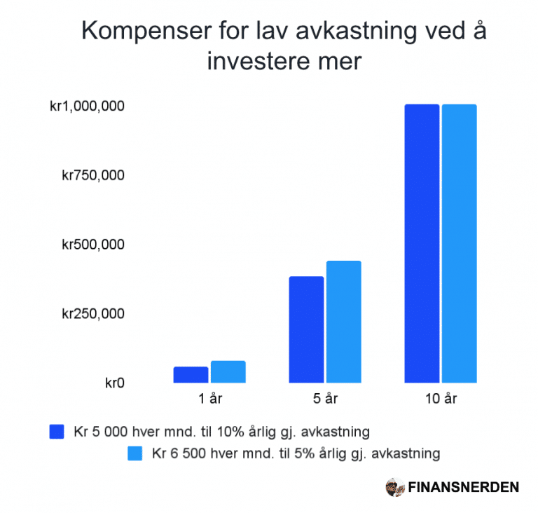 Hvor mye du investerer har mye å si for sluttresultatet. Så er du bekymret for at avkastningen i aksjemarkedet skal bli lav, kan du kompensere ved å investerer mer.