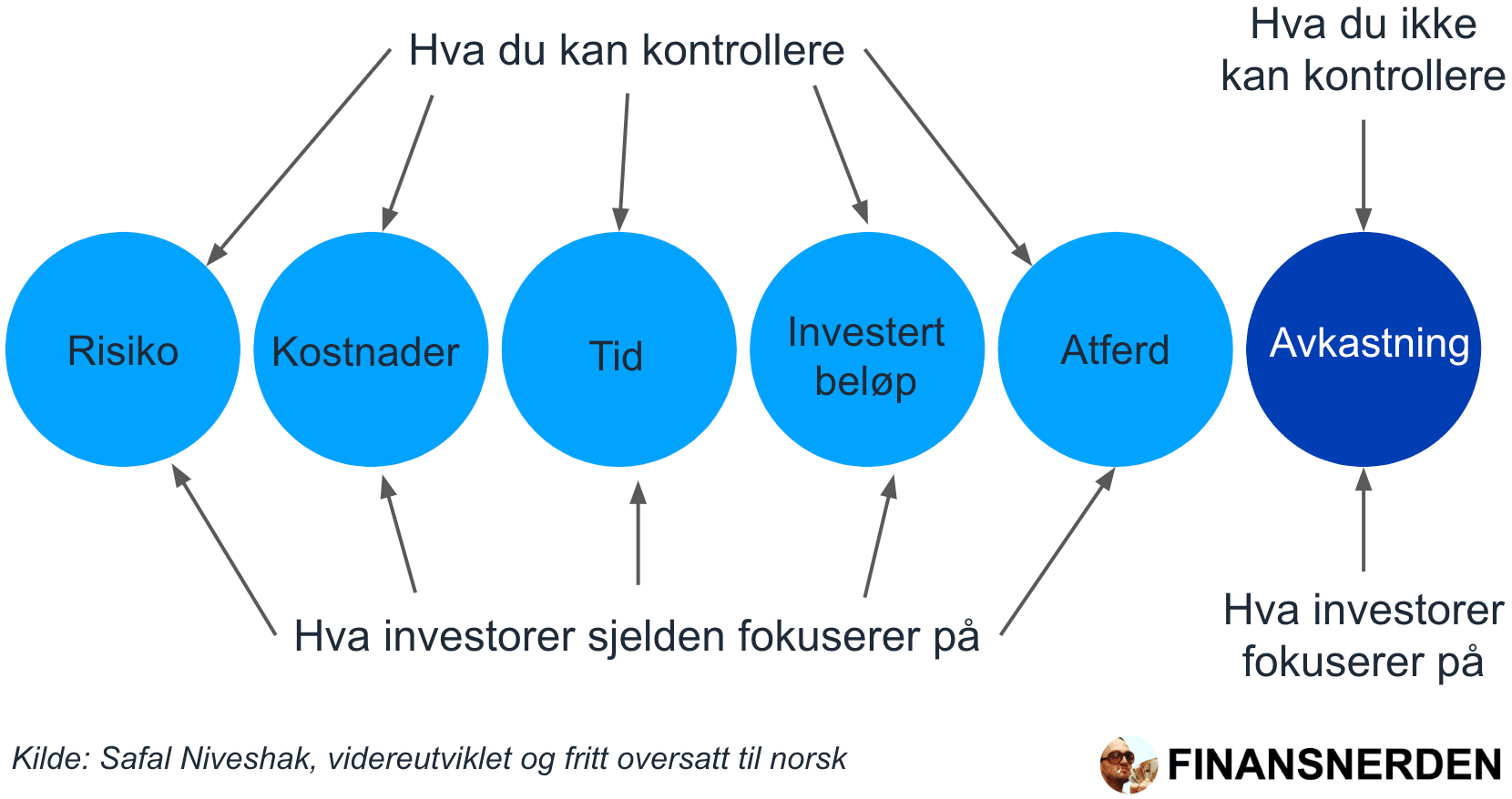 Kort sagt: Skal du få god avkastning på sparepengene dine, må du fokusere på det som teller. Det handler om risikoen du tar, kostnader, hvor lenge du er investert, hvor mye du investerer og atferden din.