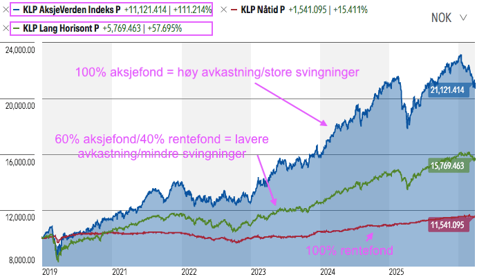 Eksempel: 5 000 kroner investert i et aksjefond hver måned i ti år, kan bli en million kroner (før skatt og inflasjon) om du oppnår 10% årlig gjennomsnittlig avkastning.