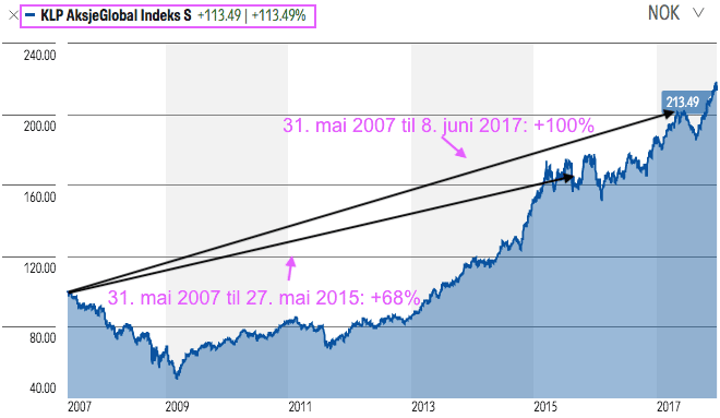 Si du investerte en million kroner i et globalt indeksfond 31. mai 2007. Målet var å doble pengene (før skatt og inflasjon) i løpet av åtte år for å kjøpe hytte.