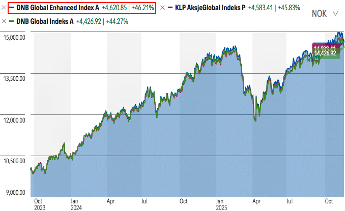 Igjen inkluderer ikke tallene for DNBs fond alle kostnader. Juster for det, og DNB Global Enhanced Index A har levert omtrent som KLP AksjeGlobal Indeks P.