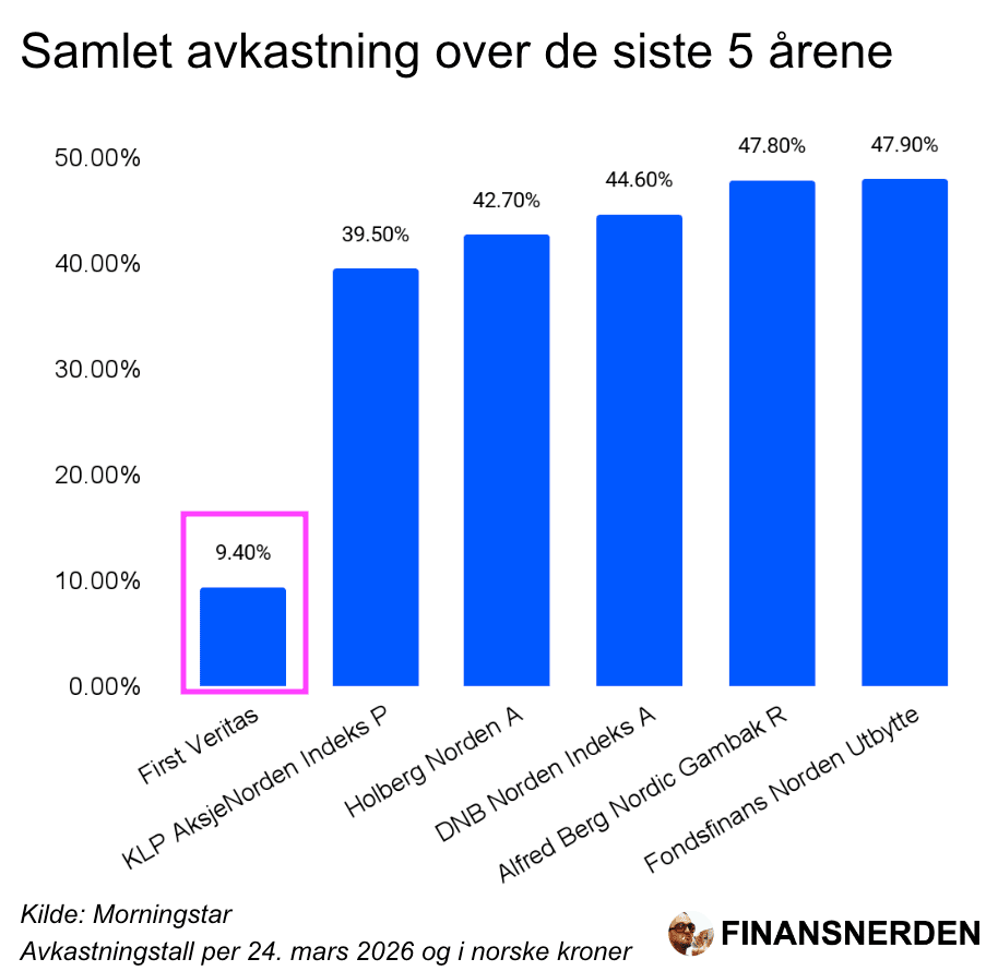 Samlet avkastning i First Veritas over de fem siste årene er redusert til knapt 9% (i det jeg skriver dette). Mens nordiske indeksfond er opp 39%-45% i samme periode.