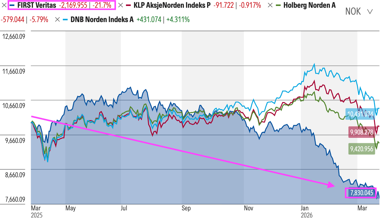 ⚠️Det ser bedre ut om du ser på avkastningen fra da First Veritas ble lansert i 2019. Men nedturen det siste året, gjør at fondet likevel henger etter nordiske indeksfond.