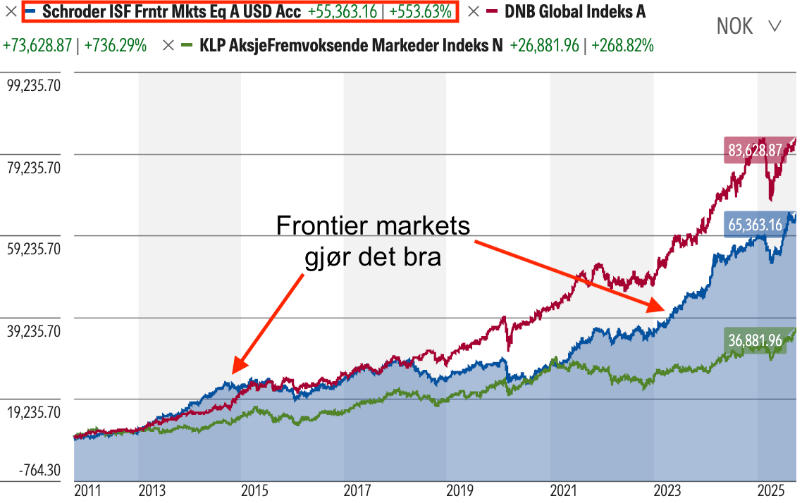 Etter børsfallet i 2020 var det motsatt. Da hang frontier markets etter, mens fremvoksende markeder og globale indeksfond steg. I oktober 2022 snudde det igjen, og siden har enkelte frontier markets fond slått globale indeksfond!