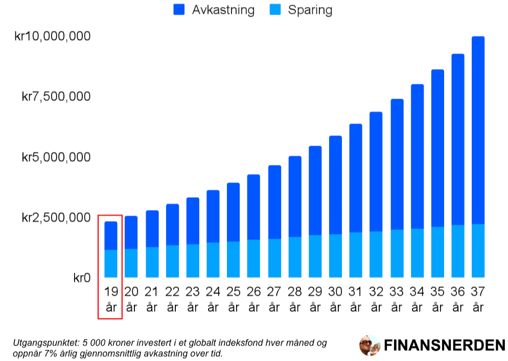 Si du investerte 5 000 kroner av inntekten din i et av de beste globale indeksfondene hver måned i 37 år, fra du fyller 30 år og frem til du er 67 år.