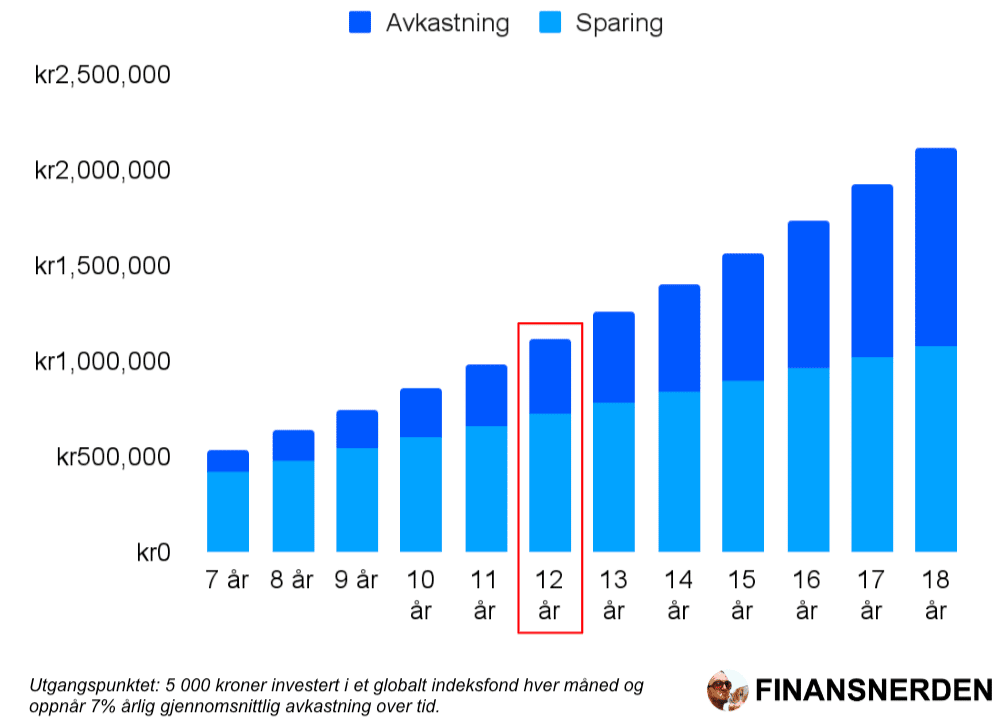- ✅Sparing er spesielt viktig de første årene: Avkastningen biter ikke før etter elleve-tolv år, og hvor mye du greier å investere avgjør hvor mye det blir.