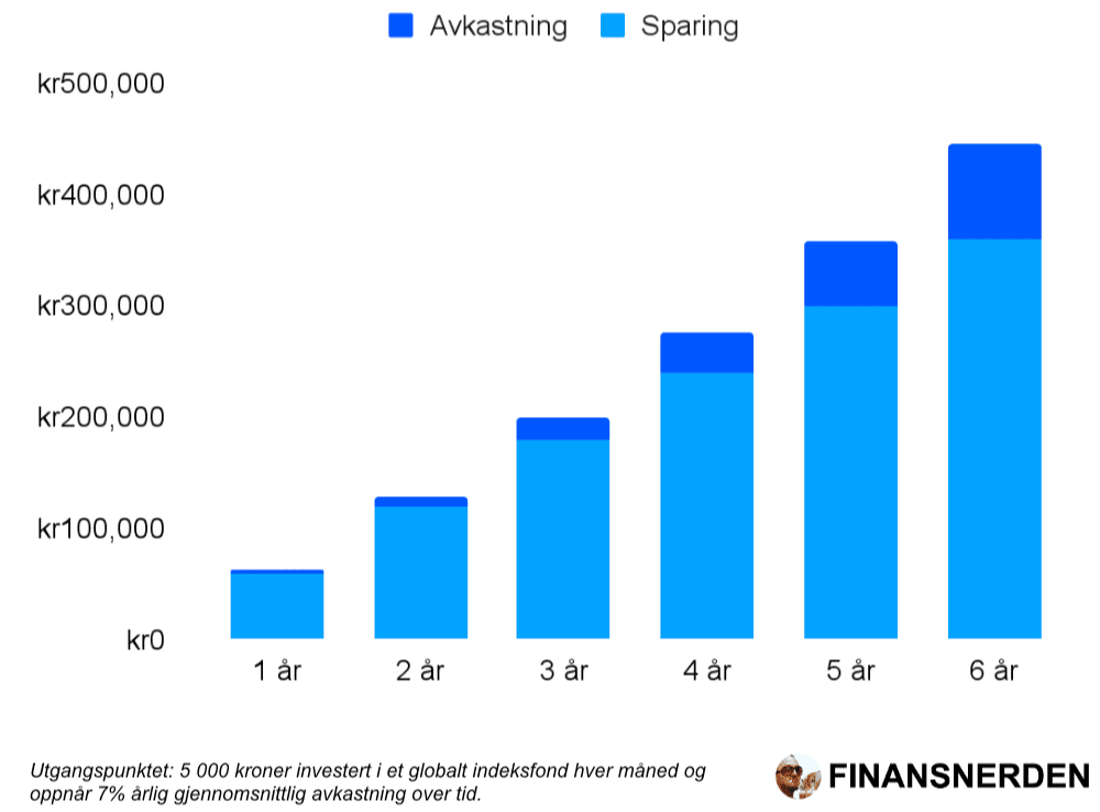 Nedsiden er at du ikke lenger kjenner at de 5 000 du investerer månedlig drar noe særlig.